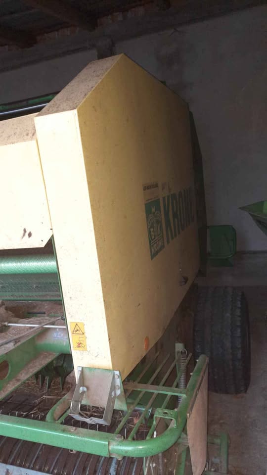 Presa de baloti model: Krone Vario Pack 1500 cu pick-up lat, roti late, legare cu plasă și sfoară.